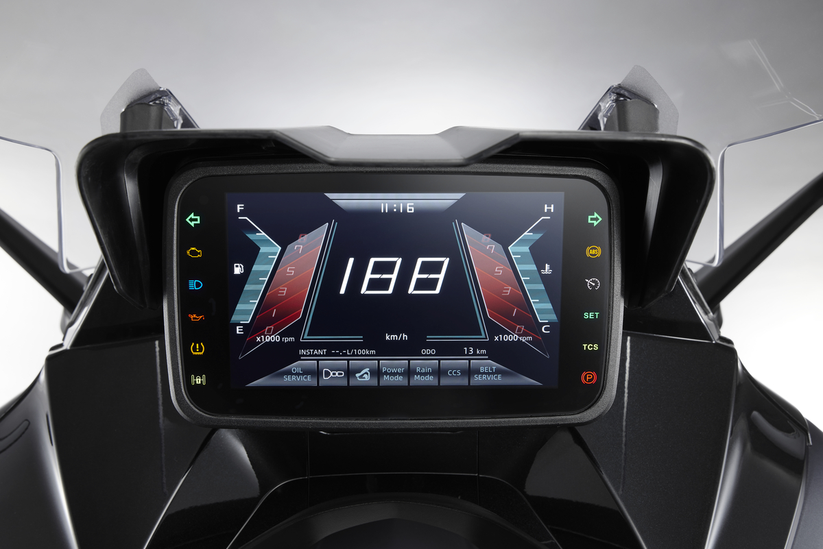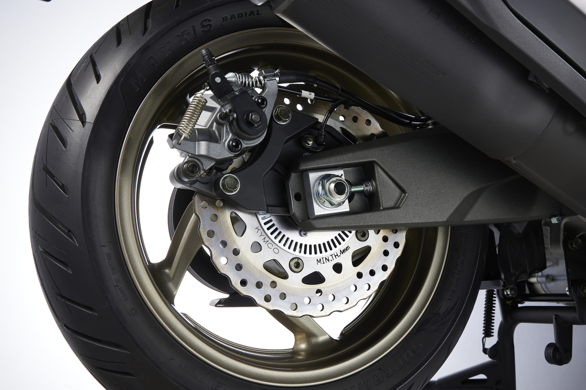 Además, pese a la complejidad en sí mismo del tren delantero, el reparto de pesos de CV3 575 es perfecto, 50/50 entre eje delantero y trasero. Este equilibrio es un logro técnico KYMCO por sus diferentes propuestas técnicas de alto nivel que derivan en su excepcional comportamiento dinámico.