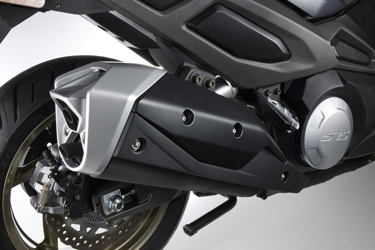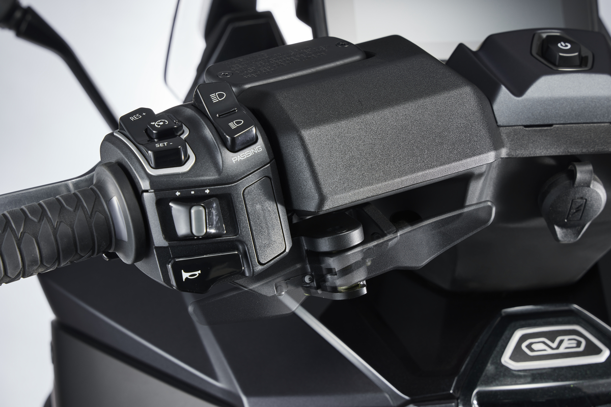 CV3 575, diseñado para largas distancias, dispone de una amplia pantalla TFT de 7 pulgadas con indicadores completos, menús intuitivos, panel de control, control de crucero, puños calefactables de tres niveles, cúpula regulable en dos posiciones, sistema keyless de acceso y arranque sin llave, asiento ergonómico con respaldo ajustable en 4 posiciones para el piloto; bajo el asiento, el cofre con apertura eléctrica e iluminación interior permite guardar un casco integral y objetos adicionales.