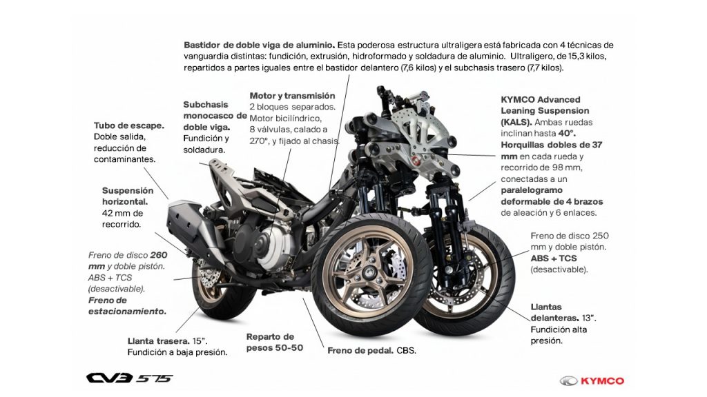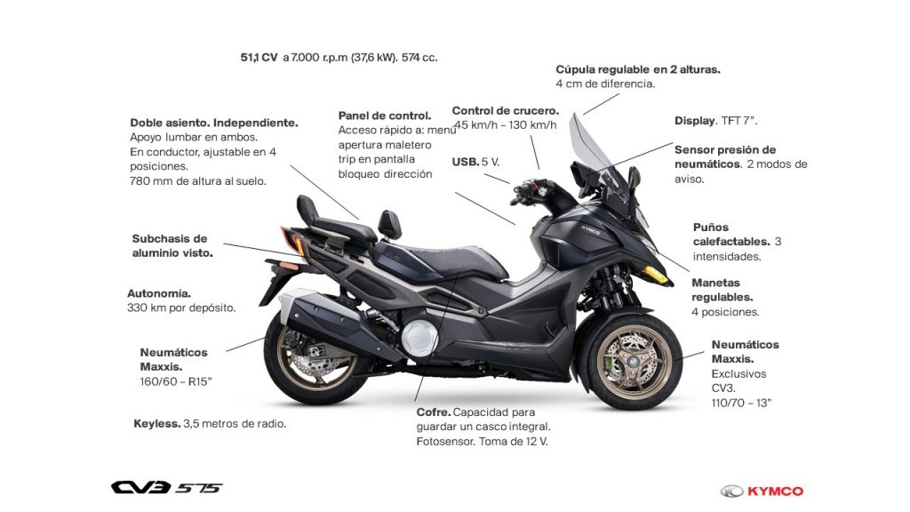 CV3 575 inaugura en España el segmento deportivo premium de scooters de tres ruedas (L5e), dirigido a los usuarios con carné de coche B y 21 años de edad cumplidos. Con más de 30 patentes -en el chasis, motor y sistema eléctrico al servicio de su comportamiento estable y dinámico-, CV3 575 desarrolla 51,1 CV y estará disponible en noviembre en todos los puntos oficiales KYMCO de España, en dos acabados (blanco y negro) y con un precio de venta recomendado de 11.950 euros.